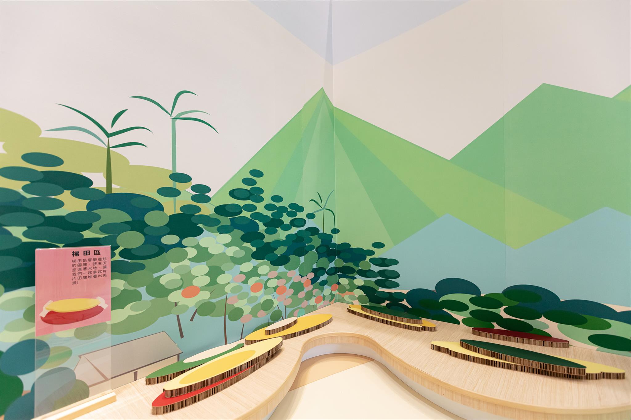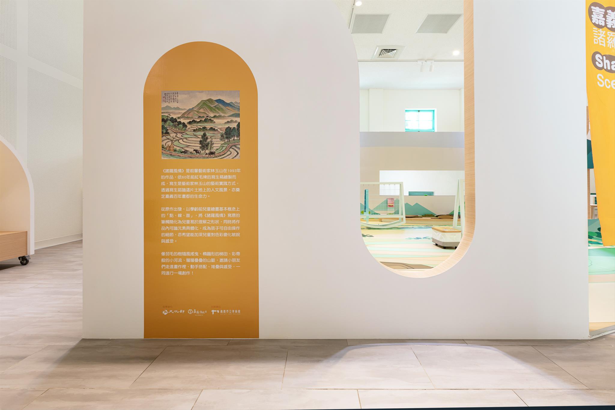 從原作出發,以學齡前兒童繪畫基本概念上的「點、線、面」,將《諸羅風情》寫意的筆觸簡化為兒童易於理解之圖像,同時將作品內可識元素具體化,成為孩子可自由操作的細節,亦希望能加深兒童對不同材質與色彩變化的敏銳與感受。像羽毛的樹隨風搖曳、橢圓形的梯田、彩帶般的小河流、層層疊疊的山脈,邀請小朋友們走進畫作裡,動手來改變、堆疊與感受,一同進行一場僅屬於嘉義的畫畫課!