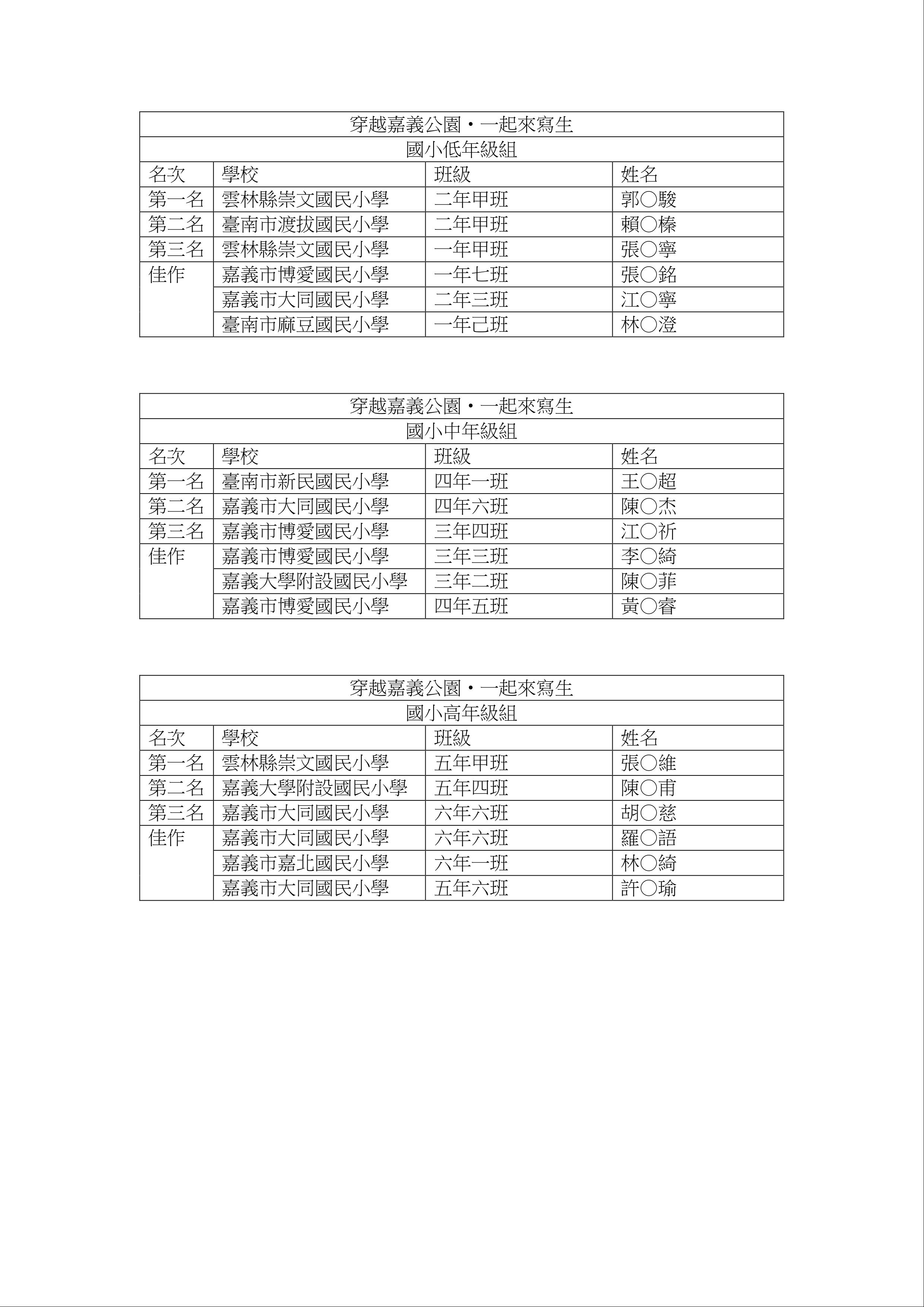 今年度從319件作品中,由三位嘉義資深藝術家鄭建昌老師、戴明德老師、王德合老師共同評審,從國小低、中、高年級、國中、高中、大專以上暨社會組共6組中,分別選出各組前三名及佳作,恭喜36位參賽者得獎。