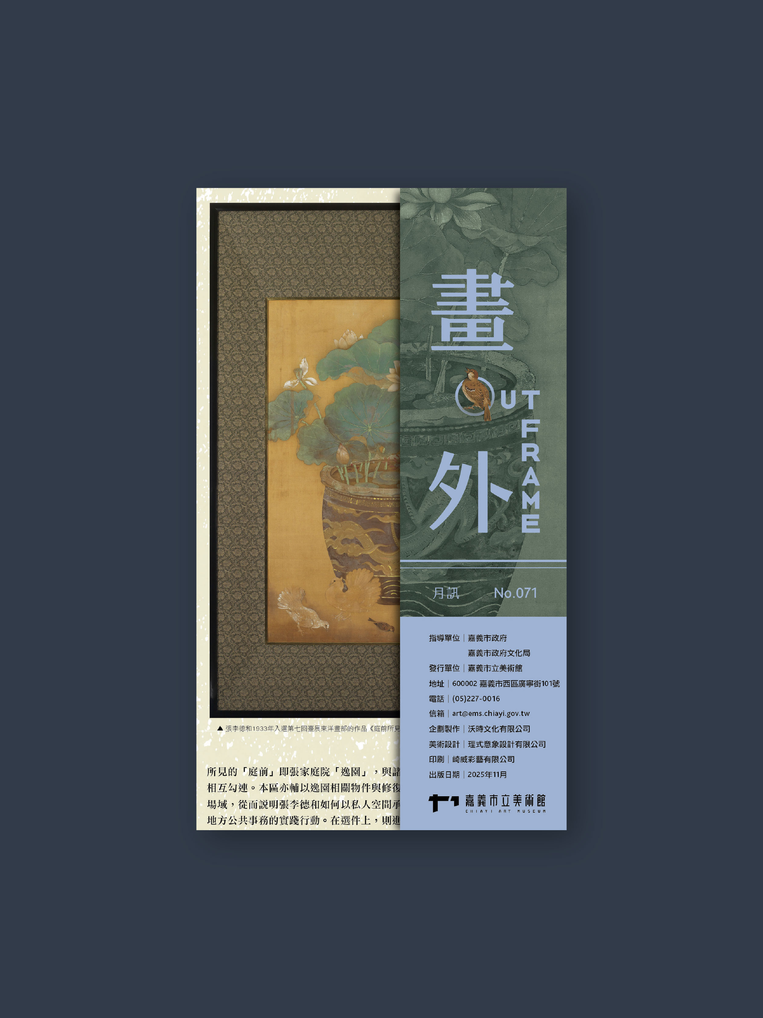 本期正面介紹嘉美館的文創商品,與設計師潘岳霖合作「我的嘉義日常 你的家飾風景」,以鎮館之寶陳澄波《展望諸羅城》、林玉山《諸羅風情》,以及具備在地意象的《像畫家的故鄉致敬》,經由設計之手,轉化製成造型地墊、畫框水杯與蠟筆組。 背面介紹嘉美館近期舉辦8場「能力+1,實戰+1:想成為S級館員的我」人才培訓系列講座,主題涵蓋友善平權、觀眾研究、策展實踐、文物保存、數位藝術與檔案管理。