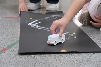 2. 學生以鉛筆規劃道路並貼上黑色膠帶,建立街道輪廓。