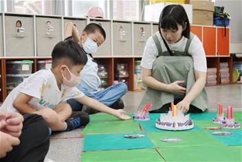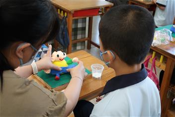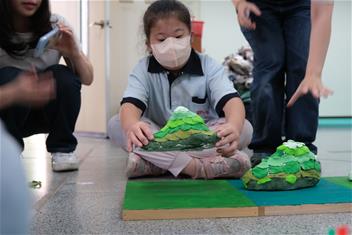 中期課程進入主題深化,帶領同學對比古今桃城樣貌,動手製作噴水池和阿里山模型。透過捏塑山形、描繪建築等實作,結合色彩深淺變化觀察,逐步建構出立體的城市景觀雛形。