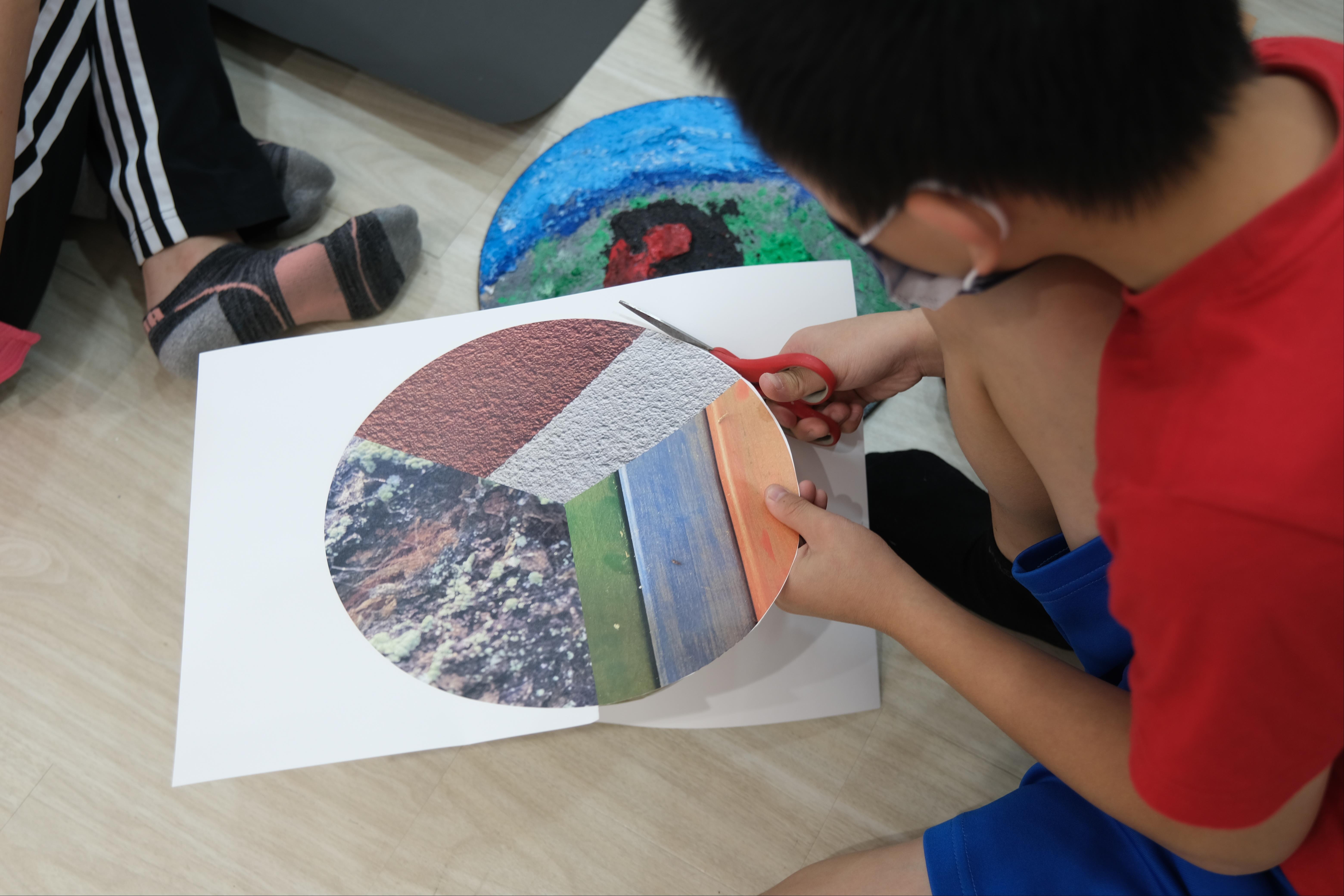 中期課程著重材質與肌理的實際操作,帶領同學學習使用石英砂、顏料等媒材塑造星球表面質感,並透過戶外拍攝蒐集自然與人造材質的紋理。這些影像素材不僅成為星球設計的靈感來源,也透過這些日常環境中容易被忽略的細節,培養同學的觀察能力與感知能力。