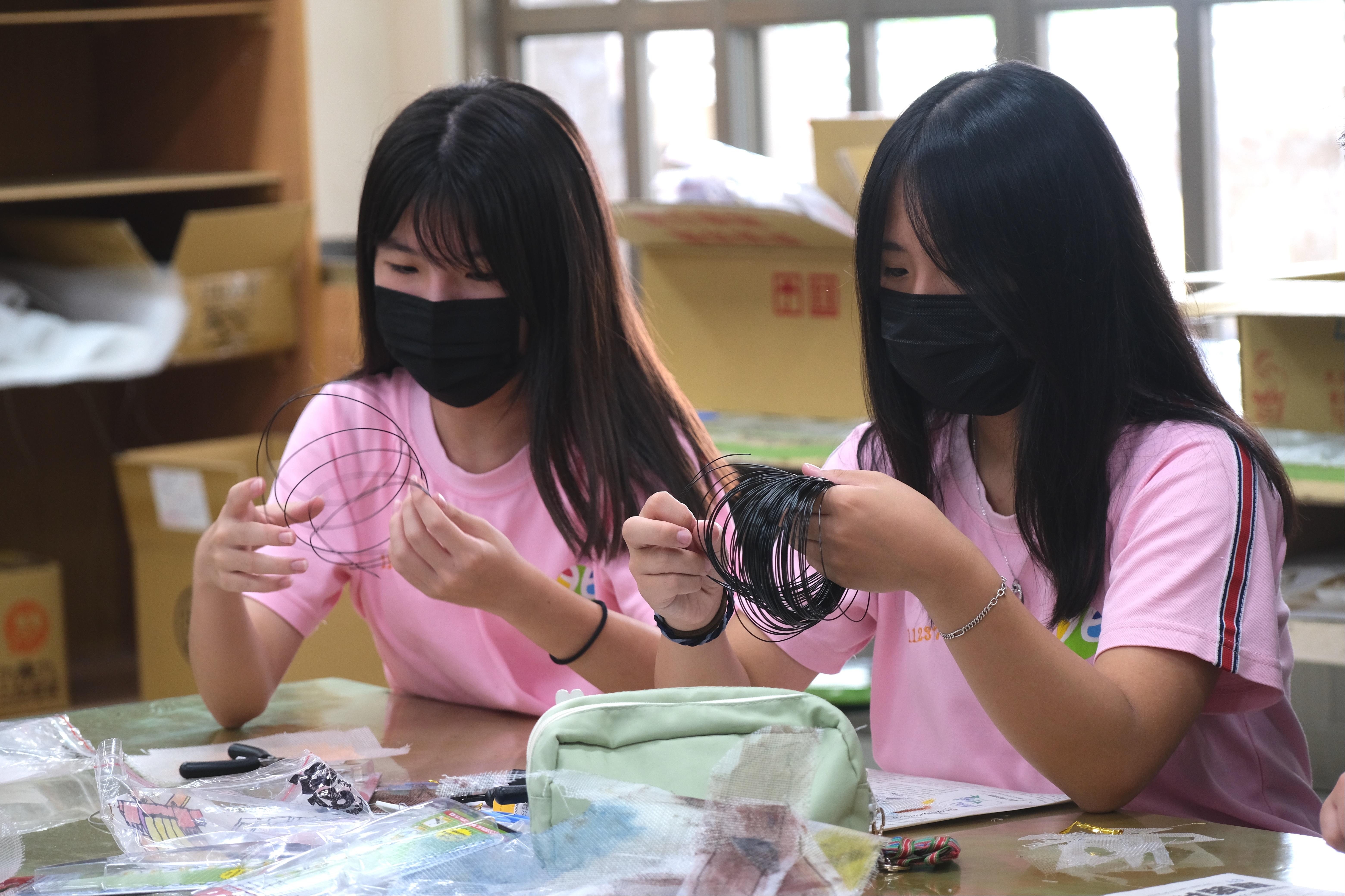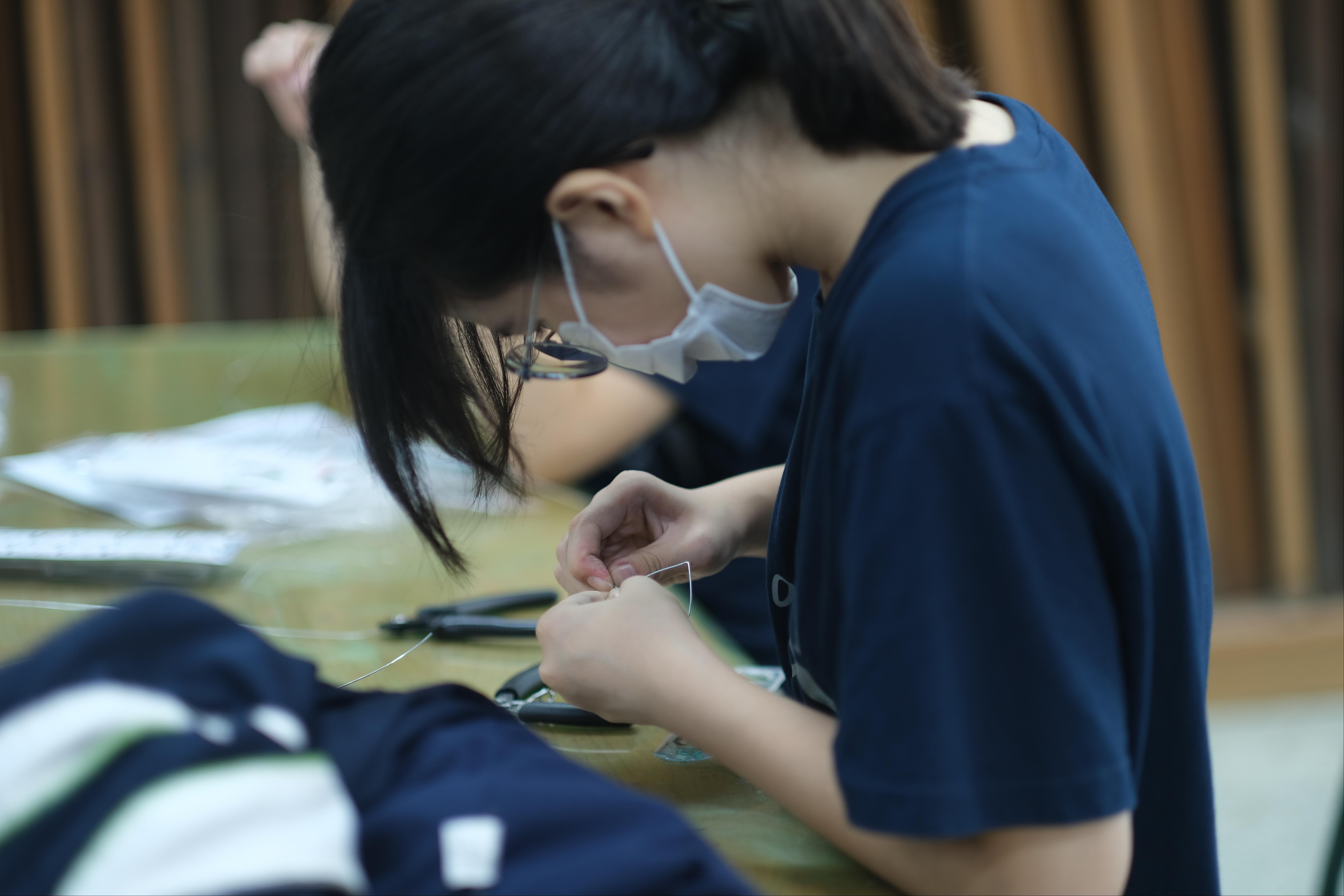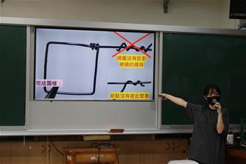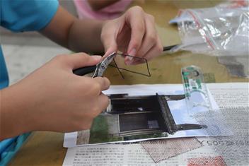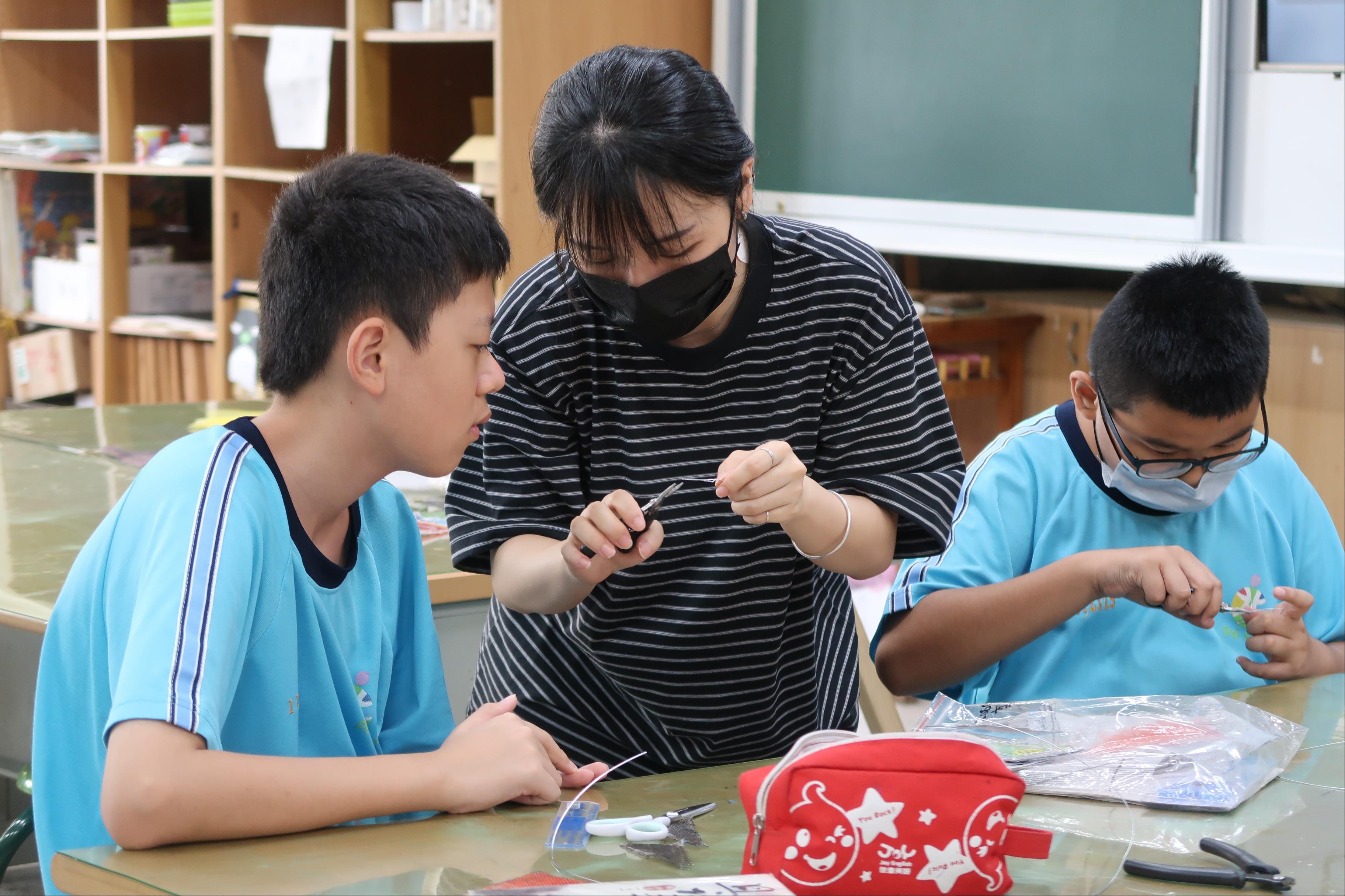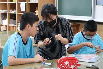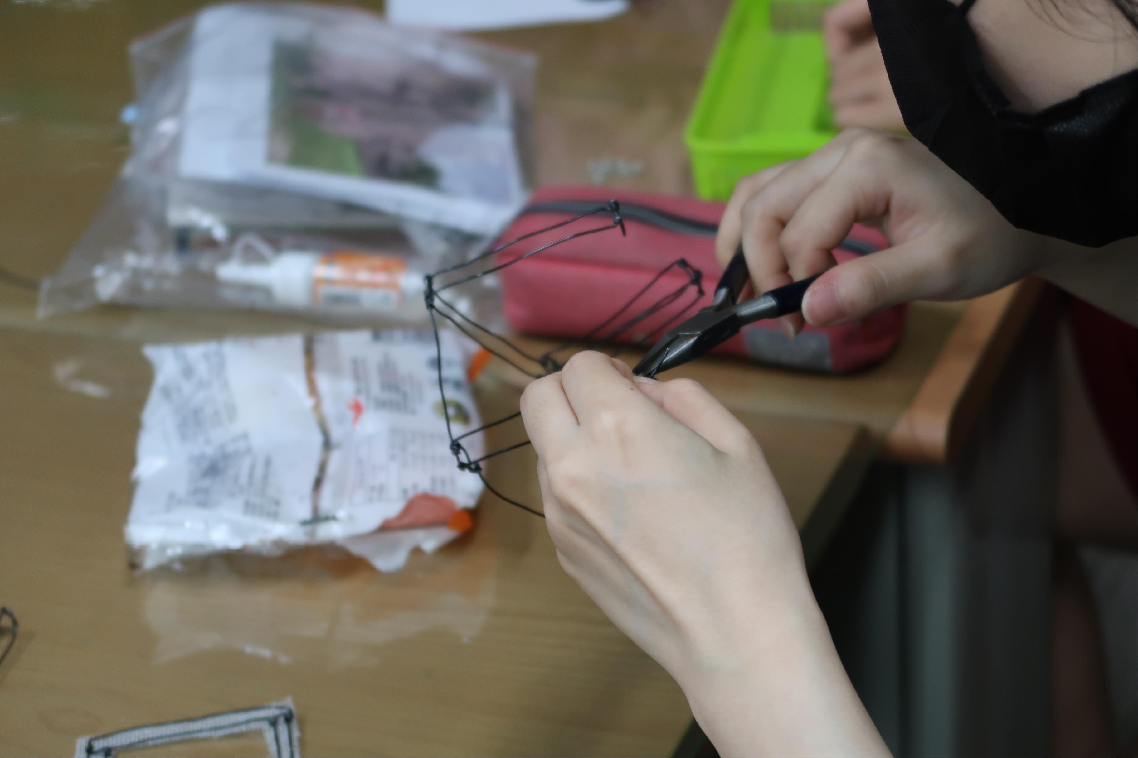 2. 帶領學生完成金屬線與塑膠網組裝,協助組員完成零件與作品整合。
