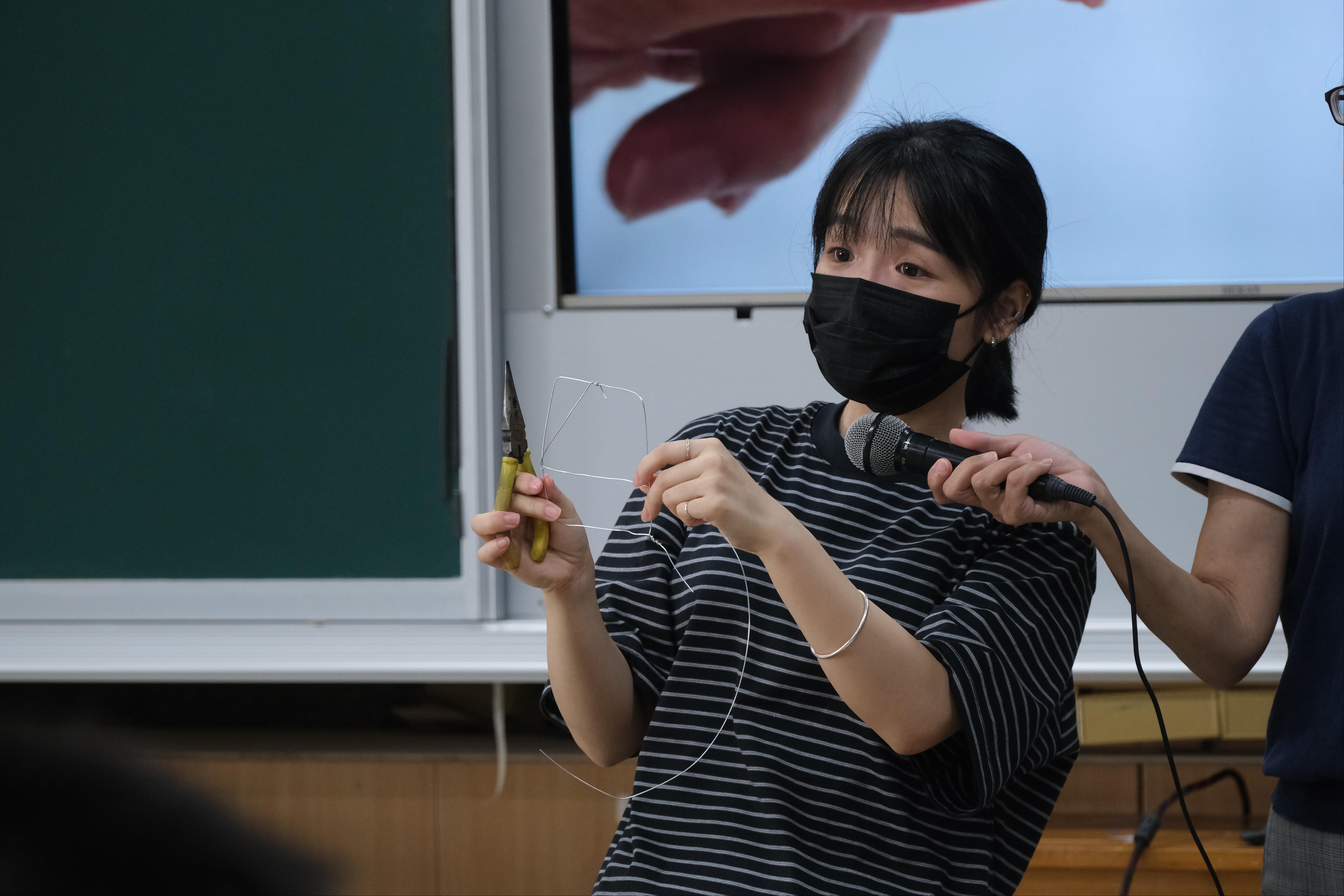 1. 回顧尖嘴鉗與金屬線操作技巧,示範基本形狀凹折方法。