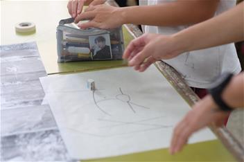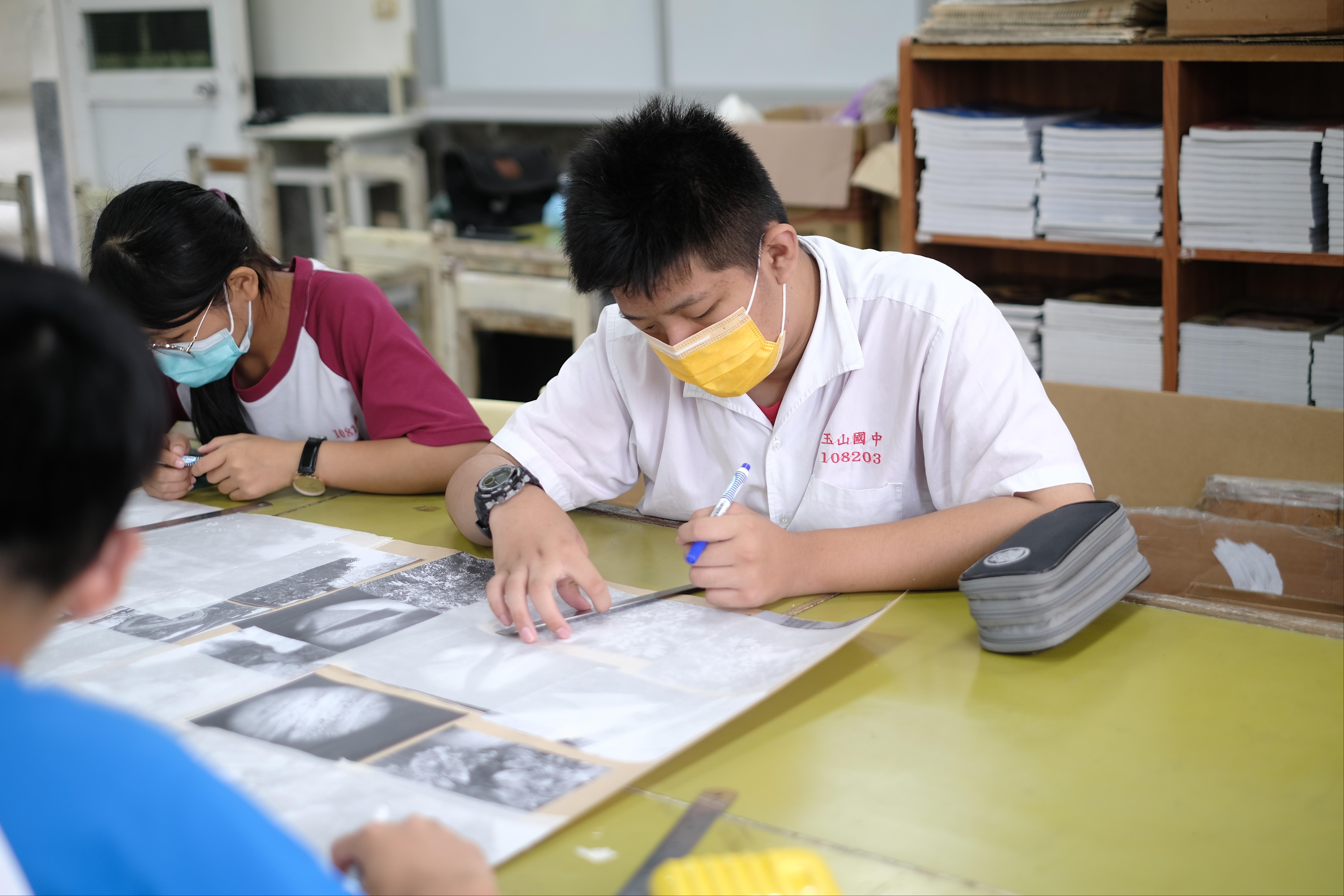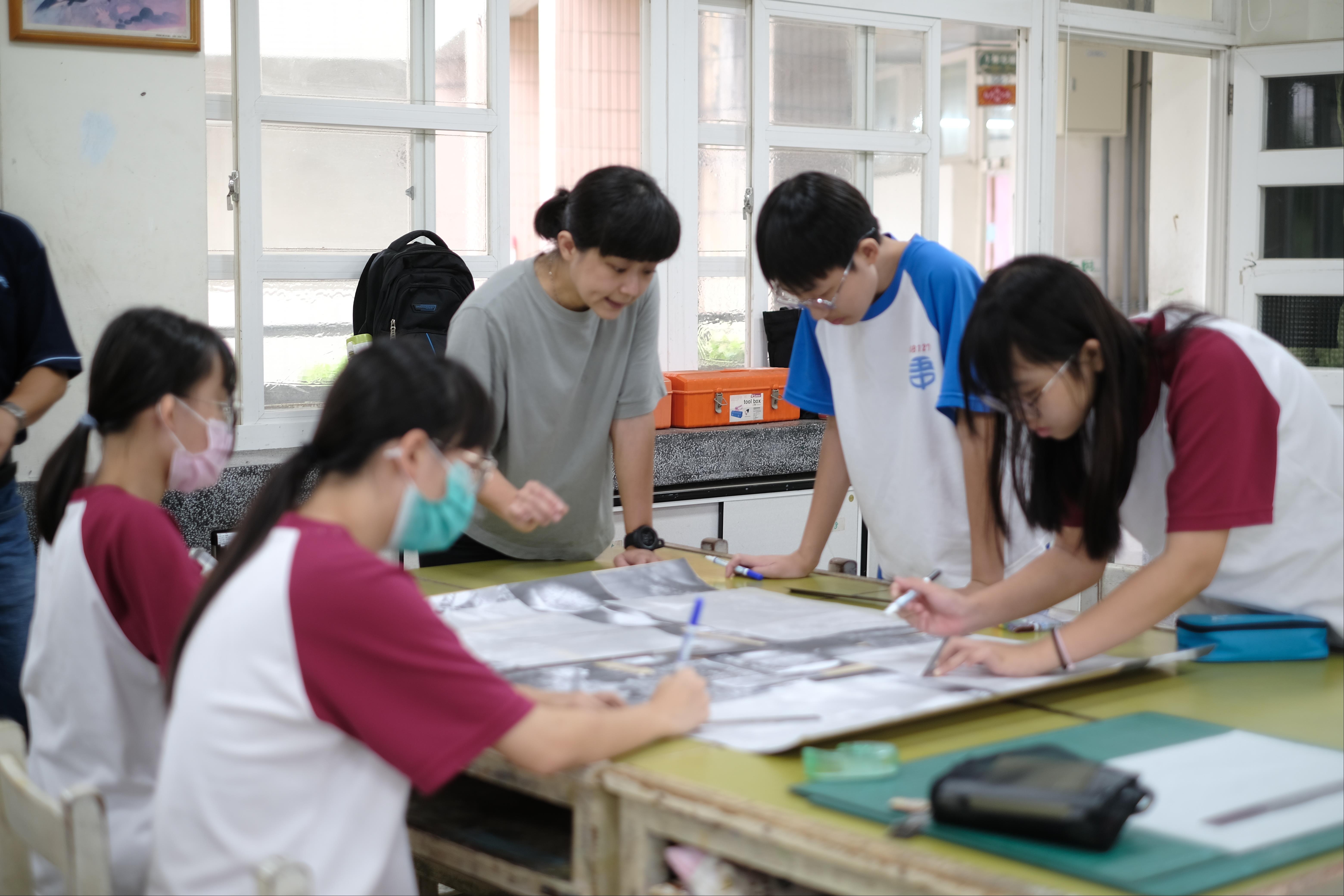 課程初期,帶領同學觀察校園植物樣貌與紋理,從實地採集與攝影紀錄出發,再進入微觀視角,透過高倍鏡觀察植物切片結構,從中提取出線條、圖形與肌理。同學藉由拼貼、描繪與分類整理,將自然形貌轉化為可供創作運用的幾何語彙。