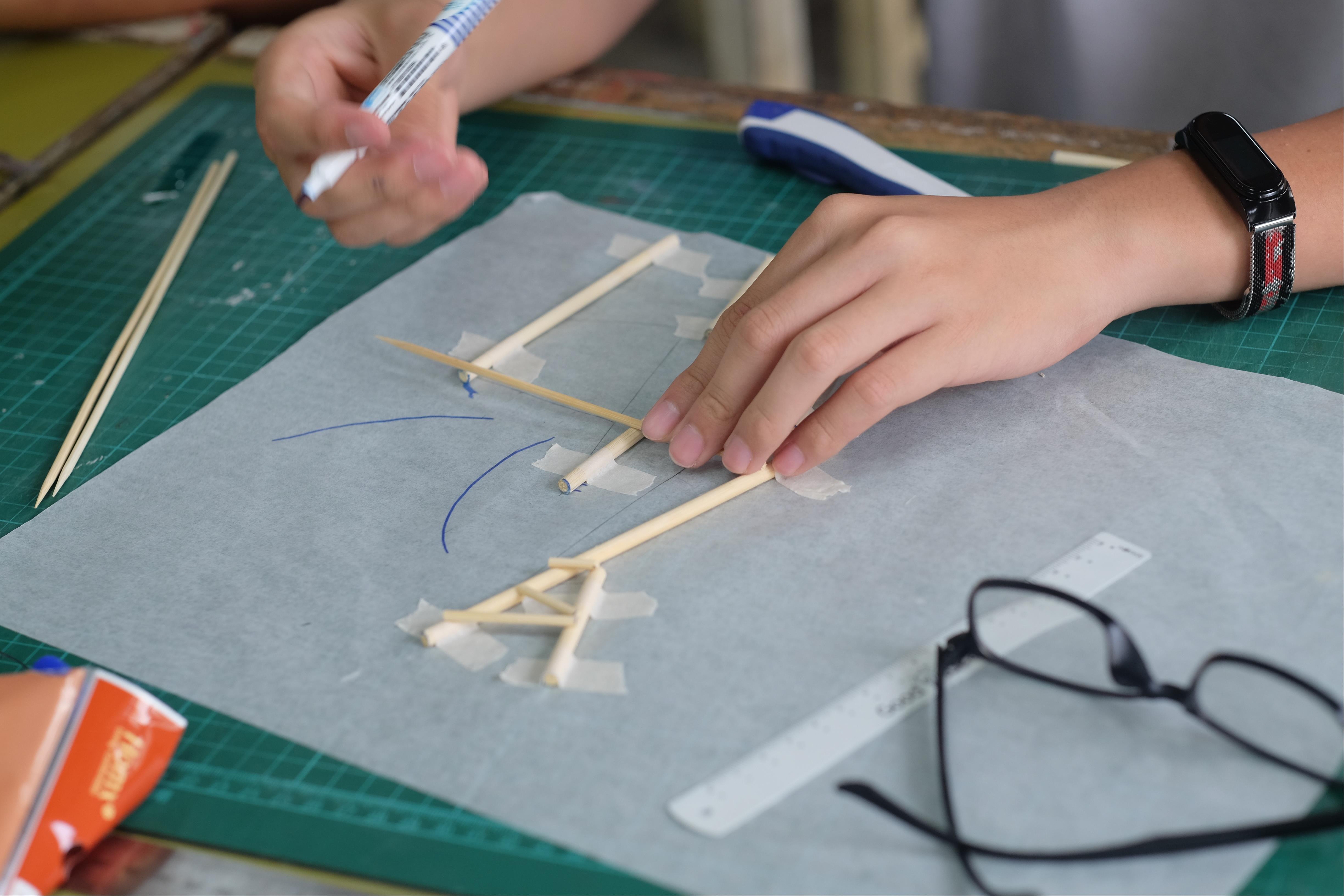 中期以這些提取元素為基礎,引導同學使用描圖紙與竹筷構築立體模型,進行結構試作與空間發展。從線構造到面材料的選擇與延展,逐步思考如何創造一個既能承載植物、也能讓人駐足的空間。